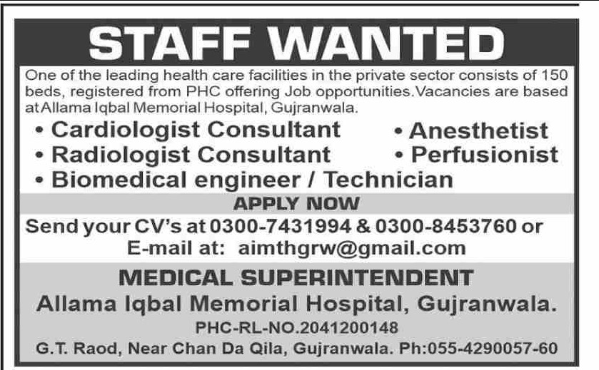 Candidates, if you are seeking Allama Iqbal Memorial Hospital Jobs In Gujranwala November 2025 if yes. It would be best if you tried to complete read the Allama Iqbal Memorial Hospital job because you can easily apply for these vacancies, MEDICAL SUPERINTENDENT. Only male candidates can apply for Allama Iqbal Memorial Hospital Jobs In Gujranwala, November 2025 Qualification /Experience Required: Cardiologist, Consultant Radiologis,t Consultant Anesthetis,t Perfusionist Biomedical engineer / Technician and more experienced candidates should apply before 10 November 2025.