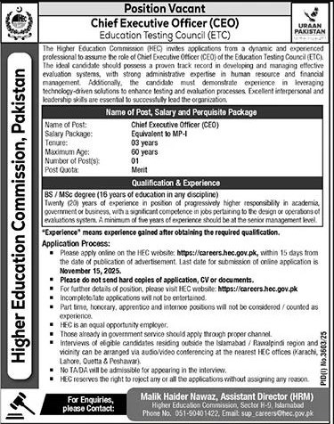 Candidates if you are seeking Commissions And Higher Education Jobs in Islamabad November 2025 if yes. It would be best if you tried to complete read Commissions And Higher Education job because you can easily apply for these vacancies chief Executive Officer (CEO) Equivalent to MP-I. Only male candidates can apply for Commissions And Higher Education Jobs in Islamabad November 2025 Qualification /Experience Required:BS/MSc degree (16 years of education in any discipline) Twenty (20) years of experience in position of progressively higher responsibility in academia, government or business, with a significant competence in jobs pertaining to the design or operations of evaluation systems. A minimum of five years of experience should be at the senior management level., and more experienced candidates should apply before 15 November 2025.