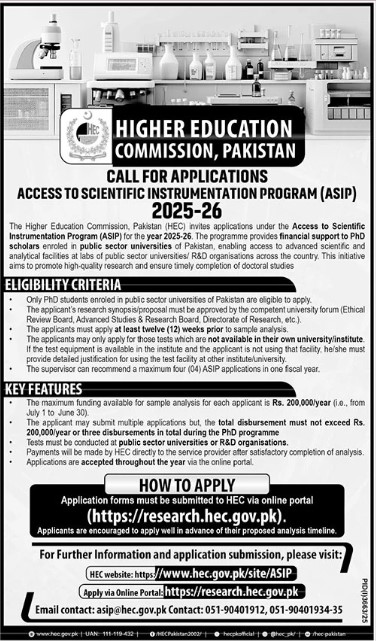 Candidates if you are seeking Higher Education Commission Jobs In Pakistan November 2025 if yes. It would be best if you tried to complete read Higher Education Commission job because you can easily apply for these vacancies ACCESS TO SCIENTIFIC INSTRUMENTATION PROGRAM (ASIP).