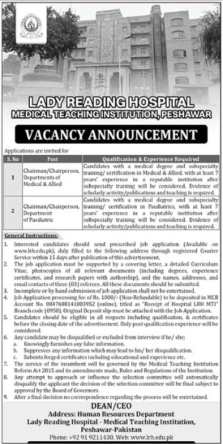 Candidates if you are seeking Lady Reading Medical Hospital Jobs In Peshawar, November 2025 if yes. It would be best if you tried to complete read Lady Reading Medical Hospital’s job because you can easily apply for these vacancies Chairman/Chairperson. Departments of Medical & Allied, Chairman/Chairperson, Department of Paediatric.