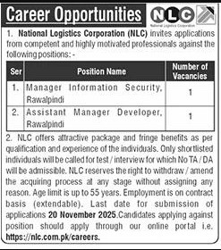 Candidates if you are seeking National Logistics Corporation NLC Jobs In Lahore November 2025 if yes. It would be best if you tried to complete read National Logistics Corporation NLC job because you can easily apply for these vacancies Manager Information Security,  Assistant Manager Developer. Only male candidates can apply for National Logistics Corporation NLC Jobs In Lahore November 2025 Qualification /Experience Required: NLC offers attractive package and fringe benefits as per qualification and experience of the individuals. Only shortlisted individuals will be called for test/interview for which No TA/DA will be admissible. NLC reserves the right to withdraw/ amend the acquiring process at any stage without assigning any reason. Age limit is up to 55 years. Employment is on contract, and more experienced candidates should apply before 20 November 2025.