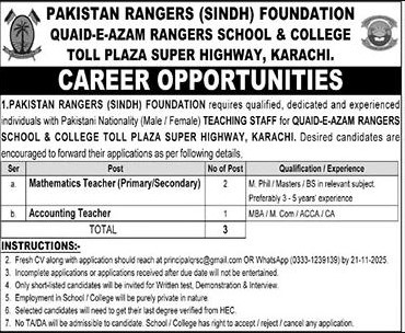 Quaid-e-Azam Rangers School And College Jobs In Karachi November 2025