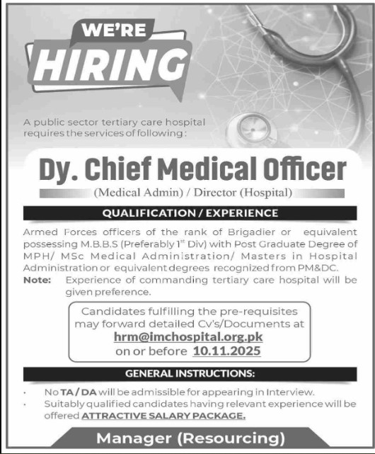Only male candidates can apply for Tertiary Care Hospital Requires Jobs In Islamabad November 2025 Qualification /Experience Required:Armed Forces officers of the rank of Brigadier or equivalent possessing M.B.B.S (Preferably 1″ Div) with Post Graduate Degree of MPH/ MSc Medical Administration/ Masters in Hospital Administration or equivalent degrees recognized from PM&DC. Note: Experience of commanding tertiary care hospital will be given preference, and more experienced candidates should apply before 10 November 2025.